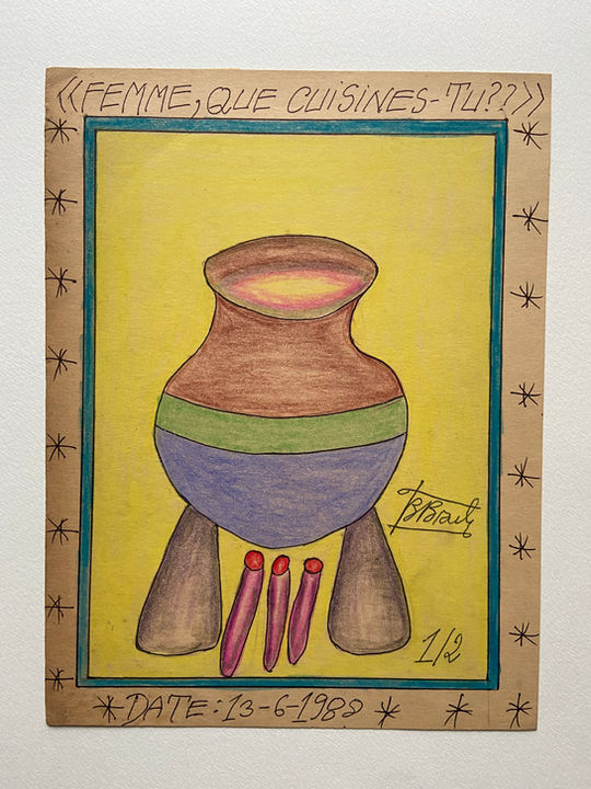 Bouabré often used such everyday objects—pots, gourds, cups, tools—as metaphors for cosmic balance and moral inquiry. His question format (“What are you cooking? What are you drinking?”) is not accusatory but philosophical, inviting reflection on human intention, responsibility, and reciprocity.